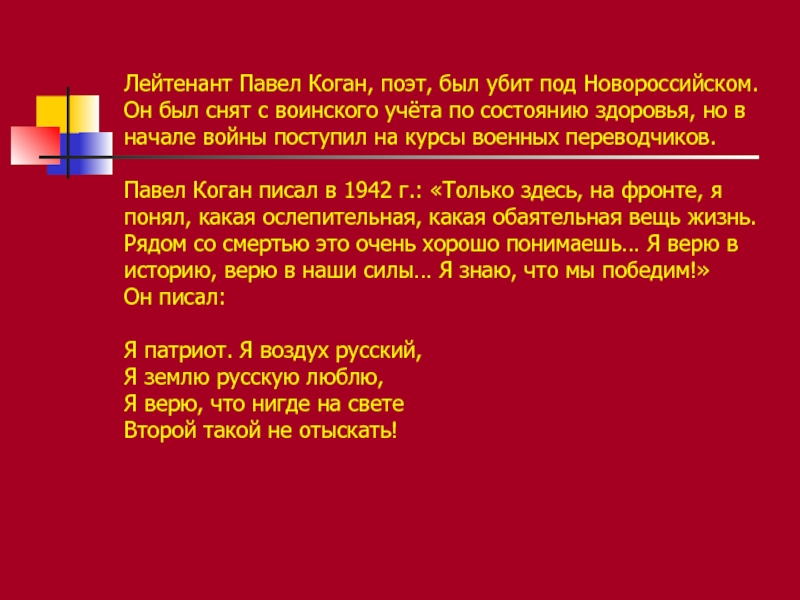 Слайд 19Лейтенант Павел Коган, поэт, был убит под Новороссийском. Он был снят