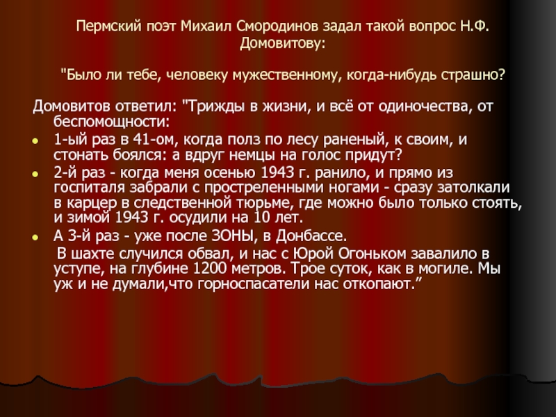 В шахте случился обвал, и нас с Юрой Огоньком завалило в уступе, на глубине 1200 метров. Трое суток, как в могиле. Мы уж и не думали,что горноспасатели нас откопают.”