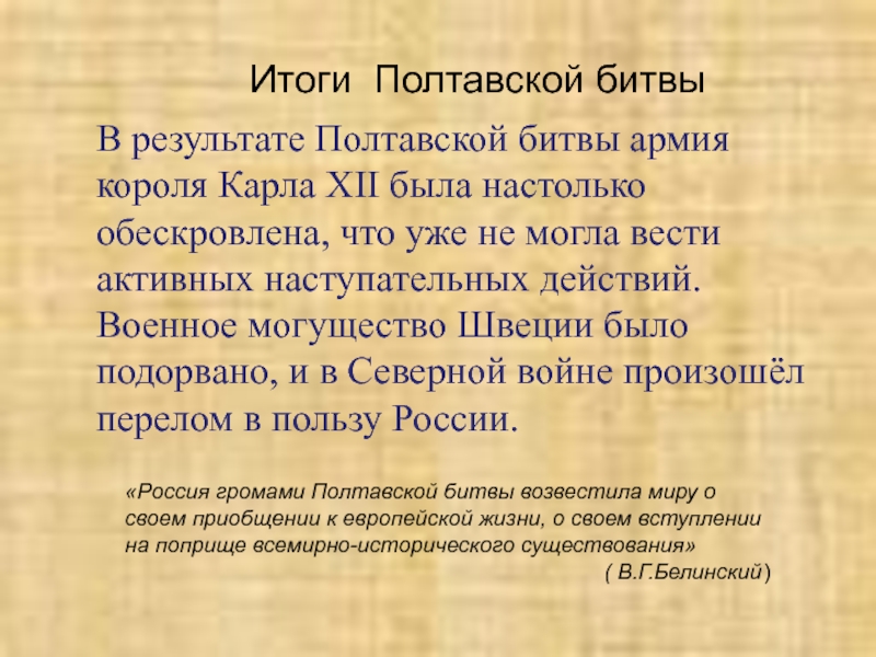 В результате Полтавской битвы армия короля Карла XII была настолько обескровлена, что уже не могла вести активных наступательных действий.
