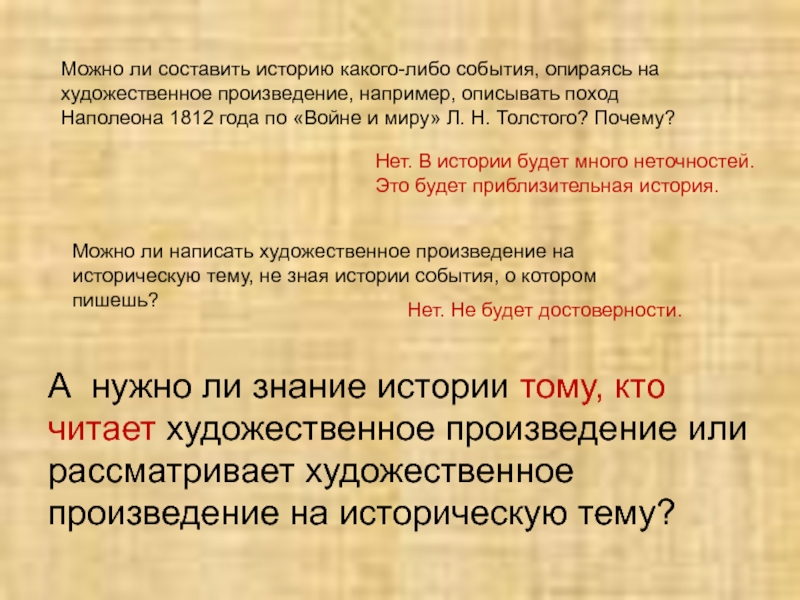 Можно ли составить историю какого-либо события, опираясь на художественное произведение, например, описывать поход Наполеона 1812 года по «Войне и миру» Л. Н. Толстого? Почему?