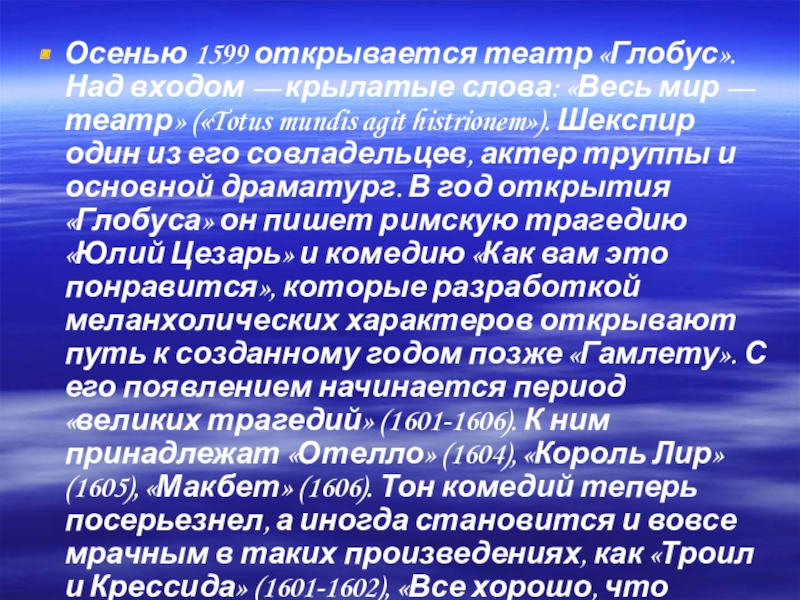мир — театр» («Totus mundis agit histrionem»). Шекспир один из его совладельцев, актер труппы и основной драматург. В год открытия «Глобуса» он пишет римскую трагедию «Юлий Цезарь» и комедию «Как вам это понравится», которые разработкой меланхолических характеров открывают путь к созданному годом позже «Гамлету». С его появлением начинается период «великих трагедий» (1601-1606). К ним принадлежат «Отелло» (1604), «Король Лир» (1605), «Макбет» (1606). Тон комедий теперь посерьезнел, а иногда становится и вовсе мрачным в таких произведениях, как «Троил и Крессида» (1601-1602), «Все хорошо, что хорошо кончается» (1603-1603), «Мера за мера» (1604).