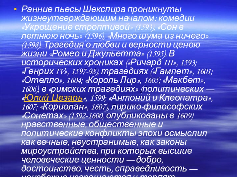 в летнюю ночь» (1596), «Много шума из ничего» (1598). Трагедия о любви и верности ценою жизни «Ромео и Джульетта» (1595). В исторических хрониках («Ричард III», 1593; «Генрих IV», 1597-98), трагедиях («Гамлет», 1601; «Отелло», 1604; «Король Лир», 1605; «Макбет», 1606), в «римских трагедиях» (политических — «Юлий Цезарь», 1599; «Антоний и Клеопатра», 1607; «Кориолан», 1607), лирико-философских «Сонетах» (1592-1600, опубликованы в 1609) нравственные, общественные и политические конфликты эпохи осмыслил как вечные, неустранимые, как законы мироустройства, при которых высшие человеческие ценности — добро, достоинство, честь, справедливость — неизбежно извращаются и терпят трагическое поражение.
