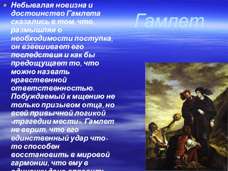 Небывалая новизна и достоинство Гамлета сказались в том, что, размышляя