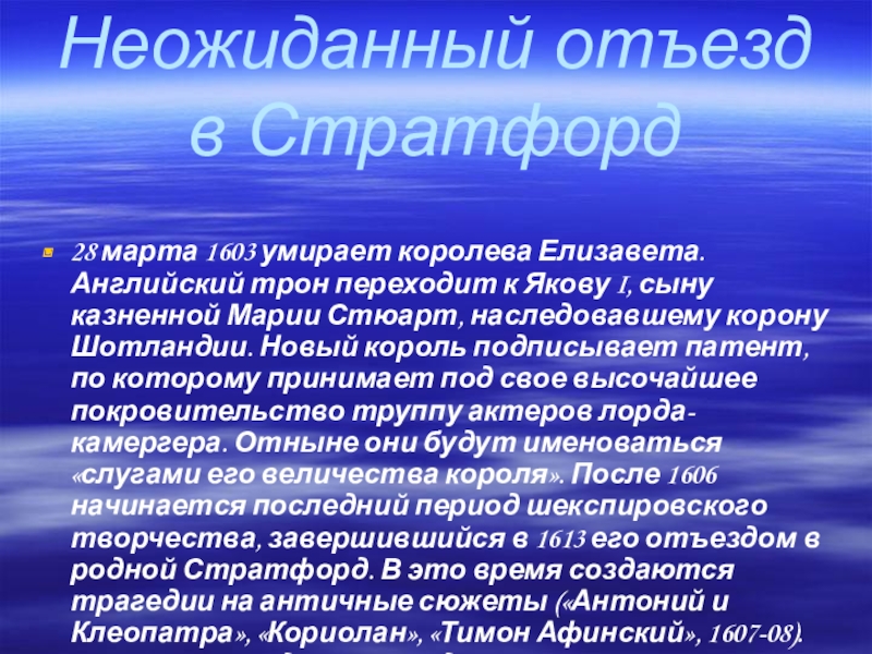 трон переходит к Якову I, сыну казненной Марии Стюарт, наследовавшему корону Шотландии. Новый король подписывает патент, по которому принимает под свое высочайшее покровительство труппу актеров лорда-камергера. Отныне они будут именоваться «слугами его величества короля». После 1606 начинается последний период шекспировского творчества, завершившийся в 1613 его отъездом в родной Стратфорд. В это время создаются трагедии на античные сюжеты («Антоний и Клеопатра», «Кориолан», «Тимон Афинский», 1607-08). За ними последовали поздние «романтические» пьесы, в числе которых «Зимняя сказка» и «Буря» (1610-12).