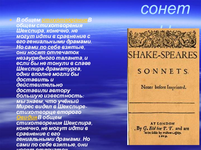 сравнение с его гениальными драмами. Но сами по себе взятые, они носят отпечаток незаурядного таланта, и если бы не тонули в славе Шекспира-драматурга, одни вполне могли бы доставить и действительно доставили автору большую известность: мы знаем, что учёный Мирес видел в Шекспире-стихотворце второго ОвидияВ общем стихотворения Шекспира, конечно, не могут идти в сравнение с его гениальными драмами. Но сами по себе взятые, они носят отпечаток незаурядного таланта, и если бы не тонули в славе Шекспира-драматурга, одни вполне могли бы доставить и действительно доставили автору большую известность: мы знаем, что учёный Мирес видел в Шекспире-стихотворце второго Овидия. Но, кроме того, есть ряд отзывов других современников, говорящих о «новом Катулле» с величайшим восторгом.