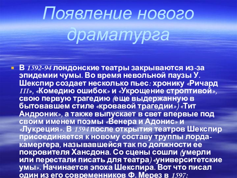 Во время невольной паузы У. Шекспир создает несколько пьес: хронику «Ричард III», «Комедию ошибок» и «Укрощение строптивой», свою первую трагедию (еще выдержанную в бытовавшем стиле «кровавой трагедии») «Тит Андроник», а также выпускает в свет впервые под своим именем поэмы «Венера и Адонис» и «Лукреция». В 1594 после открытия театров Шекспир присоединяется к новому составу труппы лорда-камергера, называвшейся так по должности ее покровителя Хансдона. Со сцены сошли (умерли или перестали писать для театра) «университетские умы». Начинается эпоха Шекспира. Вот что писал один из его современников Ф. Мерез в 1597: «Подобно тому, как Плавт и Сенека считались у римлян лучшими по части комедии и трагедии, так Уильям Шекспир у англичан является наипревосходнейшим в обоих видах пьес, предназначенных для сцены…