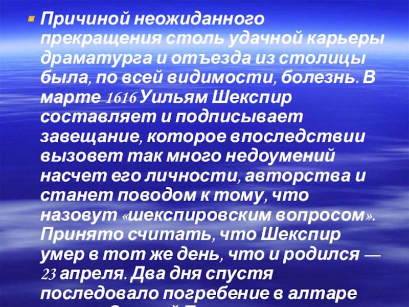 была, по всей видимости, болезнь. В марте 1616 Уильям Шекспир составляет и подписывает завещание, которое впоследствии вызовет так много недоумений насчет его личности, авторства и станет поводом к тому, что назовут «шекспировским вопросом». Принято считать, что Шекспир умер в тот же день, что и родился — 23 апреля. Два дня спустя последовало погребение в алтаре церкви Святой Троицы на окраине Стратфорда, в метрической книге которой об этом и была сделана запись