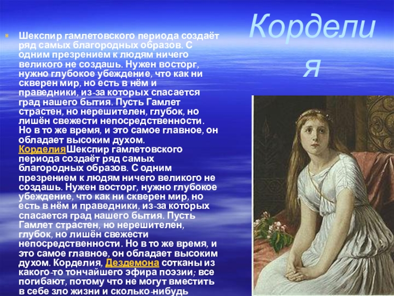 к людям ничего великого не создашь. Нужен восторг, нужно глубокое убеждение, что как ни скверен мир, но есть в нём и праведники, из-за которых спасается град нашего бытия. Пусть Гамлет страстен, но нерешителен, глубок, но лишён свежести непосредственности. Но в то же время, и это самое главное, он обладает высоким духом. КорделияШекспир гамлетовского периода создаёт ряд самых благородных образов. С одним презрением к людям ничего великого не создашь. Нужен восторг, нужно глубокое убеждение, что как ни скверен мир, но есть в нём и праведники, из-за которых спасается град нашего бытия. Пусть Гамлет страстен, но нерешителен, глубок, но лишён свежести непосредственности. Но в то же время, и это самое главное, он обладает высоким духом. Корделия, Дездемона сотканы из какого-то тончайшего эфира поэзии; все погибают, потому что не могут вместить в себе зло жизни и сколько-нибудь приспособиться к ней. Даже злодейская чета Макбетов погибает от избытка совести. А среди второстепенных лиц великих трагедий остаётся целая галерея волшебно-нежных и самоотверженных женщин и благороднейшего духа мужчин. Всё это показывает, что пессимистическое настроение художника было порождено не только созерцанием зла мира. Оно имеет свой источник и в том, что в душе его, под влиянием дум о назначении жизни, создался очень высокий идеал назначения человека. Он был так строг к миру, потому что хотел его видеть совершенным.