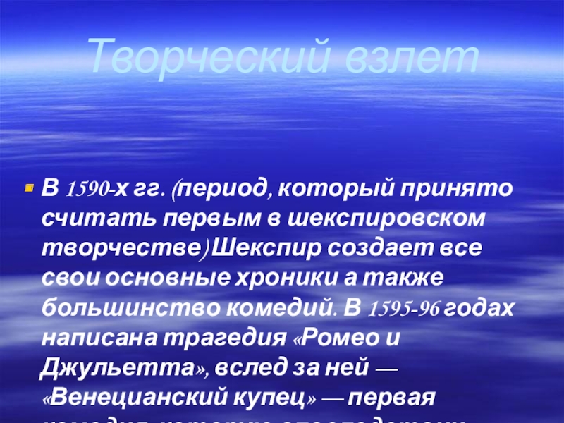 шекспировском творчестве) Шекспир создает все свои основные хроники а также большинство комедий. В 1595-96 годах написана трагедия «Ромео и Джульетта», вслед за ней — «Венецианский купец» — первая комедия, которую впоследствии назовут «серьезной».