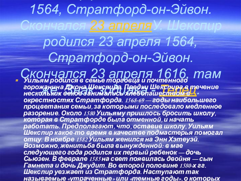 Слайд 2У. Шекспир родился 23 апреляУ. Шекспир родился 23 апреля 1564, Стратфорд-он-Эйвон.