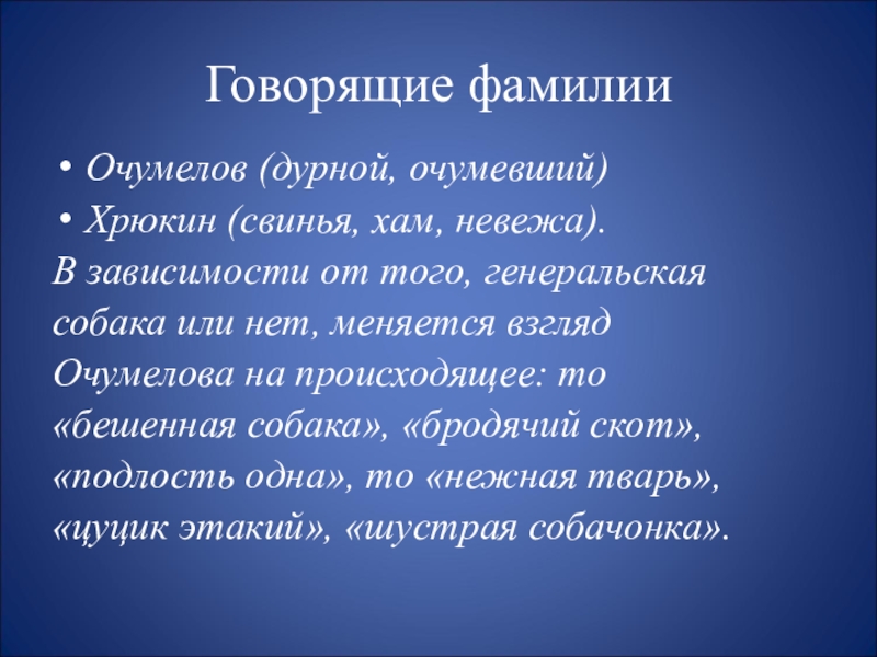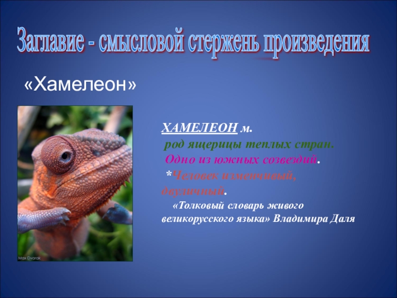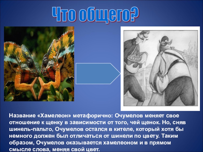 Название «Хамелеон» метафорично: Очумелов меняет свое отношение к щенку