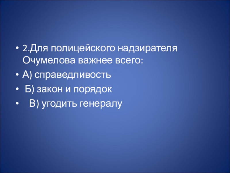 2.Для полицейского надзирателя Очумелова важнее всего: