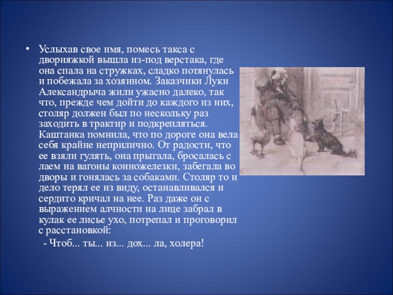 Слайд 8Услыхав свое имя, помесь такса с дворняжкой вышла из-под верстака, где