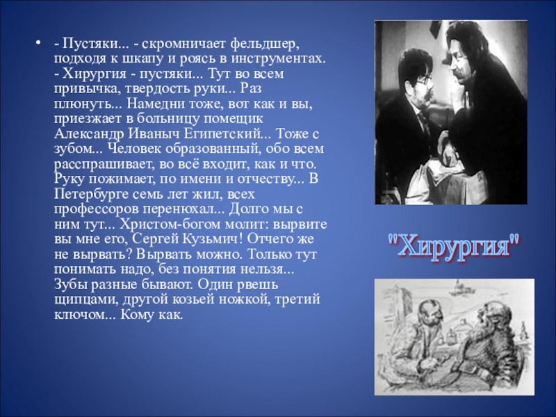 Слайд 7- Пустяки... - скромничает фельдшер, подходя к шкапу и роясь в