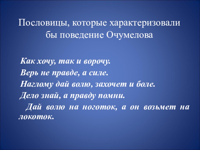 Слайд 16Пословицы, которые характеризовали бы поведение Очумелова