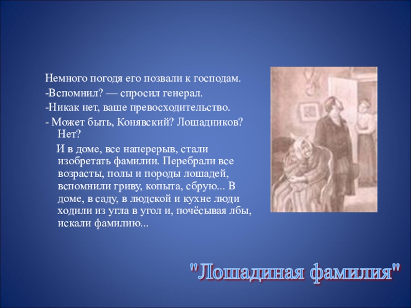 И в доме, все наперерыв, стали изобретать фамилии. Перебрали все возрасты, полы и породы лошадей, вспомнили гриву, копыта, сбрую... В доме, в саду, в людской и кухне люди ходили из угла в угол и, почёсывая лбы, искали фамилию...