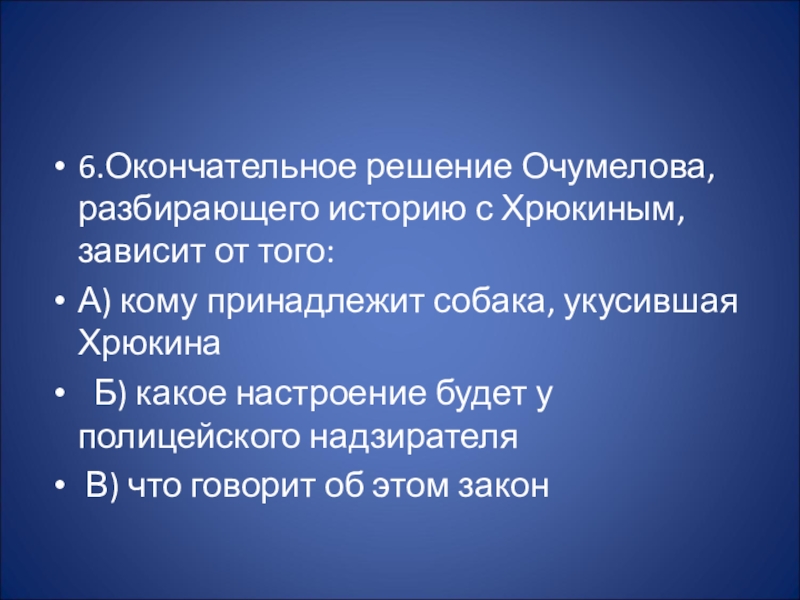 6.Окончательное решение Очумелова, разбирающего историю с Хрюкиным, зависит от того: