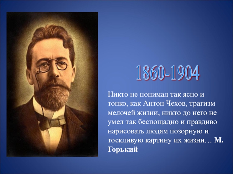 Антон Чехов, трагизм мелочей жизни, никто до него не умел так беспощадно и правдиво нарисовать людям позорную и тоскливую картину их жизни… М.Горький