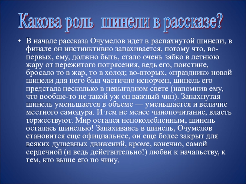 инстинктивно запахивается, потому что, во-первых, ему, должно быть, стало очень зябко в летнюю жару от пережитого потрясения, ведь его, поистине, бросало то в жар, то в холод; во-вторых, «праздник» новой шинели для него был частично испорчен, шинель его предстала несколько в невыгодном свете (напомнив ему, что вообще-то не такой уж он важный чин). Запахнутая шинель уменьшается в объеме — уменьшается и величие местного самодура. И тем не менее чинопочитание, власть торжествуют. Мир остался непоколебленным, шинель осталась шинелью! Запахиваясь в шинель, Очумелов становится еще официальнее, он еще более закрыт для всяких душевных движений, кроме, конечно, самой сердечной (и ведь действительно!) любви к начальству, к тем, кто выше его по чину.