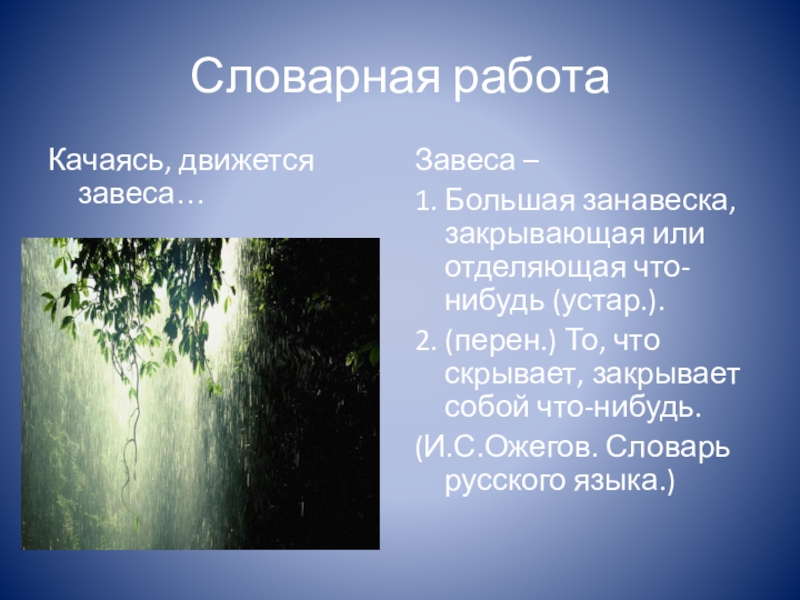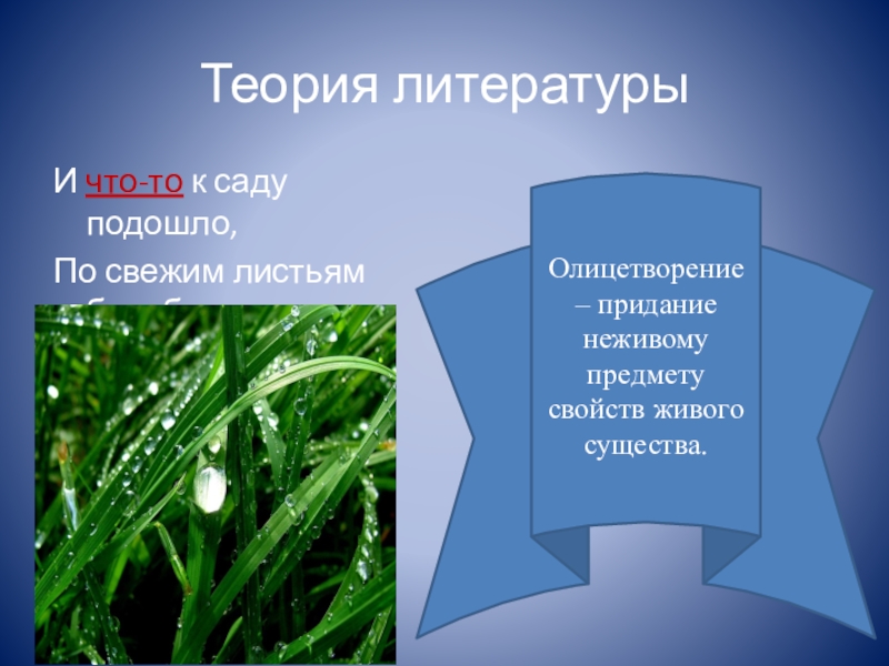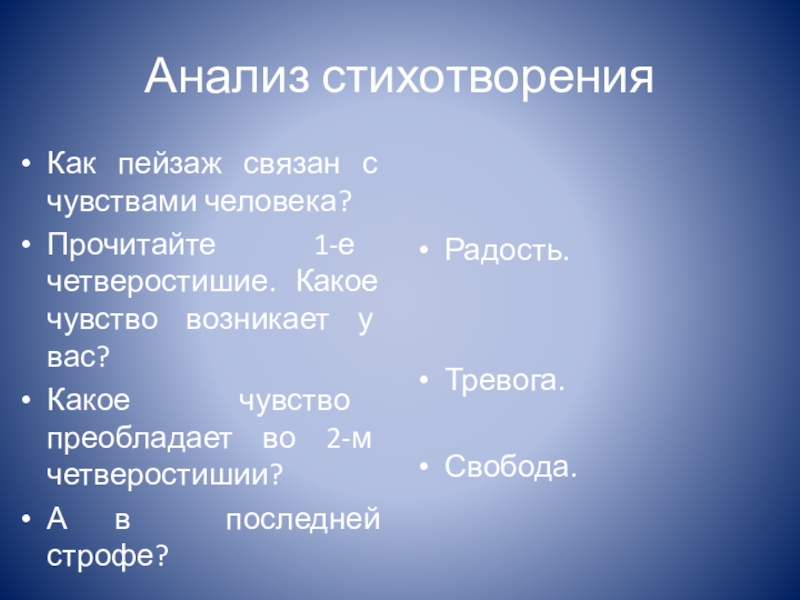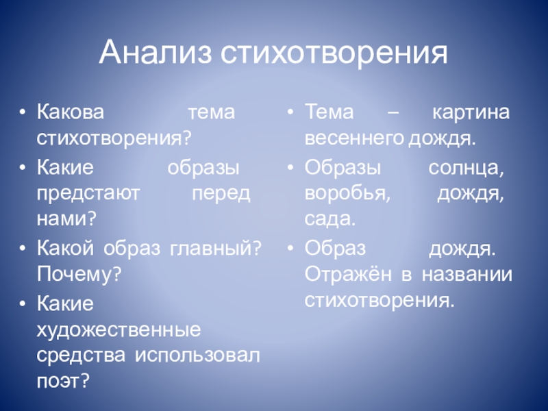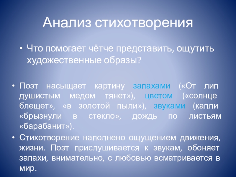 Мы чувствуем движение, видим изменения в природе. Почти каждая строчка открывает перед нами новую картину. Поэт чередует перед нами крупный и общий планы, благодаря ярким, динамичным глаголам.