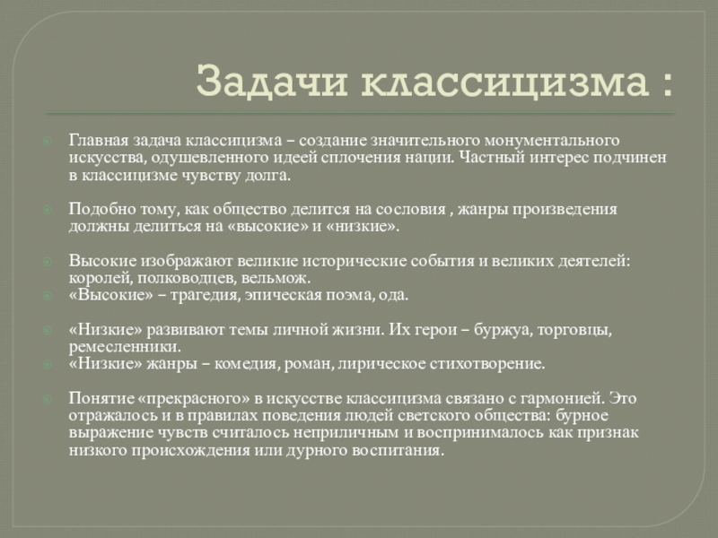 Главная задача классицизма – создание значительного монументального искусства, одушевленного