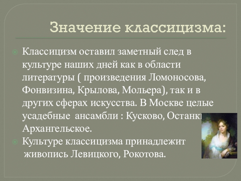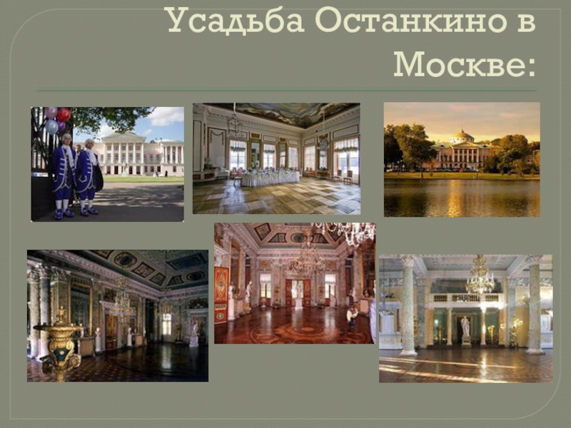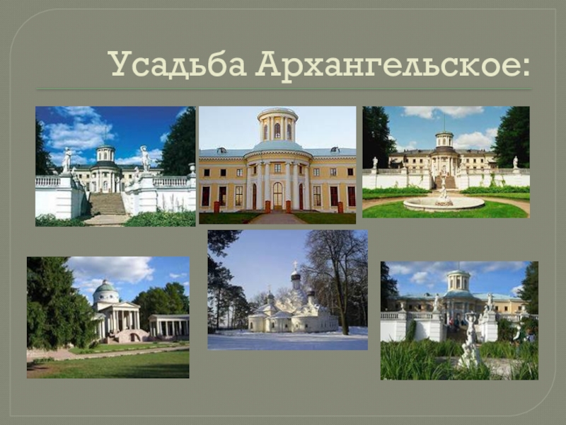 области литературы ( произведения Ломоносова, Фонвизина, Крылова, Мольера), так и в других сферах искусства. В Москве целые усадебные ансамбли : Кусково, Останкино, Архангельское.