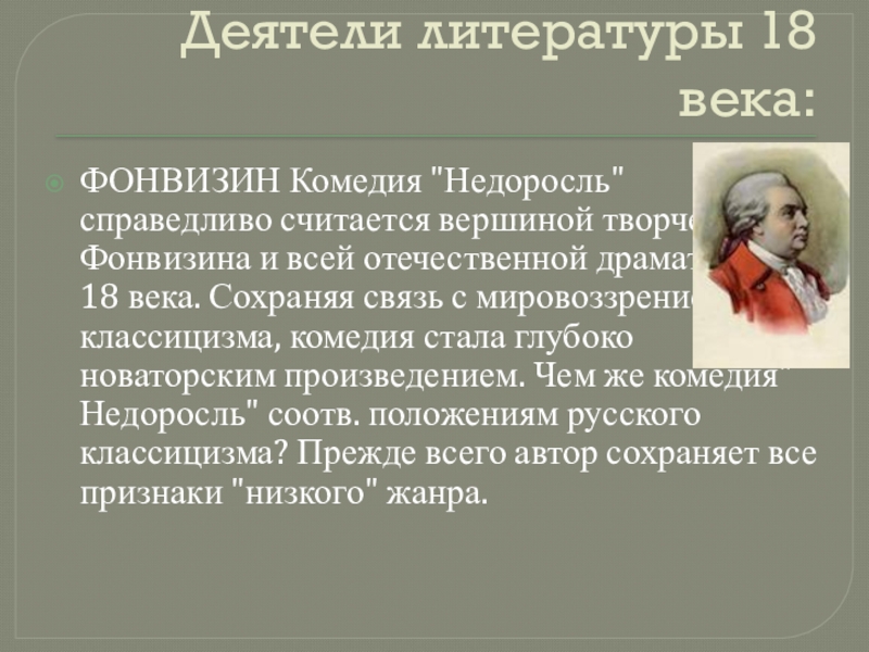 ФОНВИЗИН Комедия "Недоросль" справедливо считается вершиной творчества Фонвизина