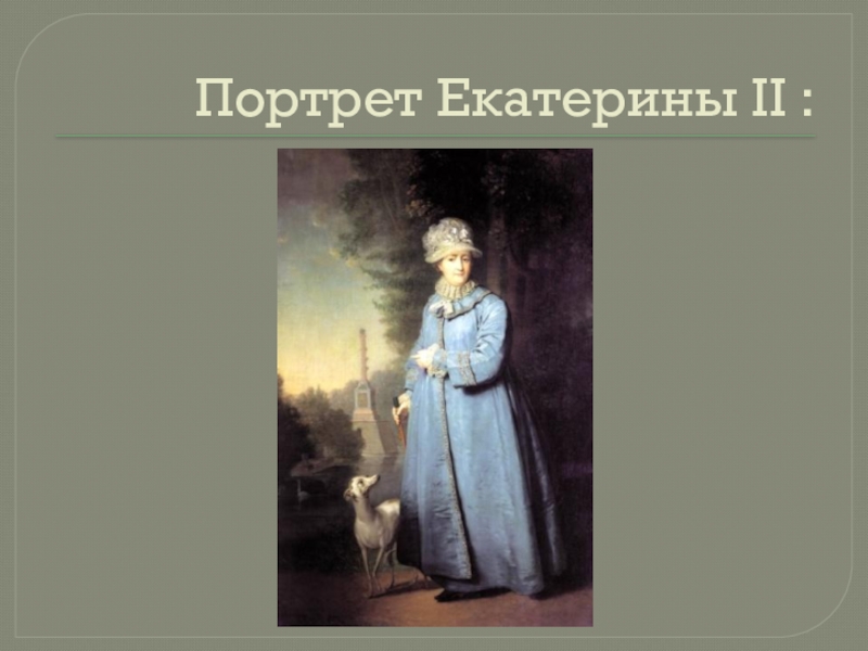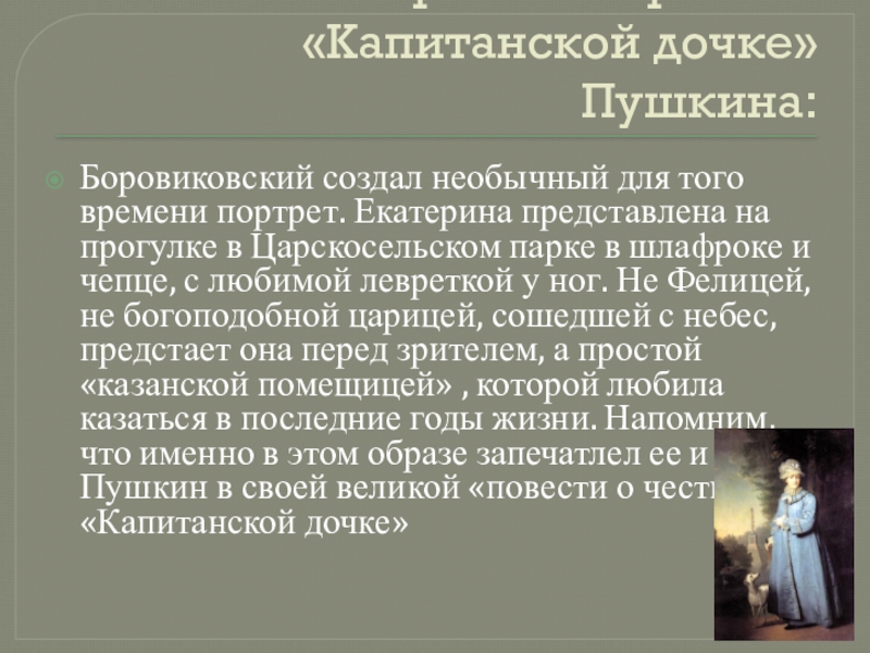 портрет. Екатерина представлена на прогулке в Царскосельском парке в шлафроке и чепце, с любимой левреткой у ног. Не Фелицей, не богоподобной царицей, сошедшей с небес, предстает она перед зрителем, а простой «казанской помещицей» , которой любила казаться в последние годы жизни. Напомним, что именно в этом образе запечатлел ее и Пушкин в своей великой «повести о чести» «Капитанской дочке»