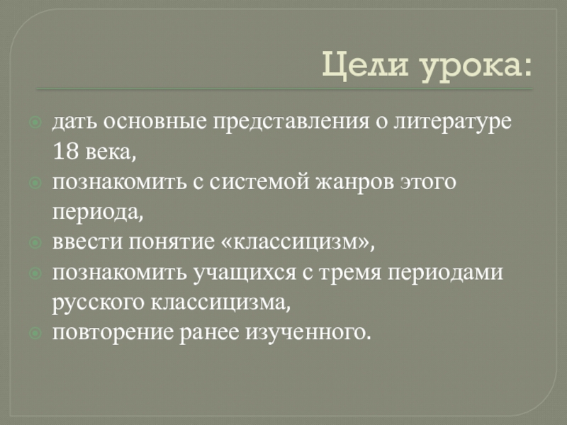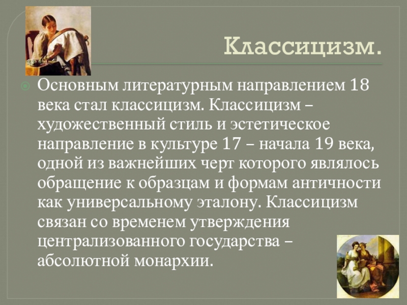 Основным литературным направлением 18 века стал классицизм. Классицизм – художественный стиль
