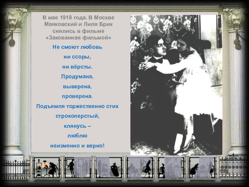 В мае 1918 года. В Москве Маяковский и Лиля Брик снялись в фильме «Закованная фильмой»