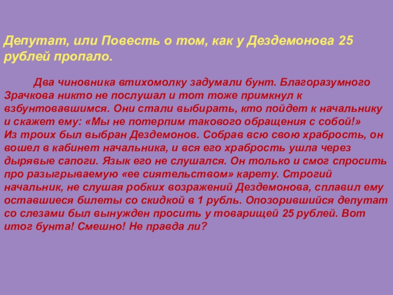Слайд 18Депутат, или Повесть о том, как у Дездемонова 25 рублей пропало.