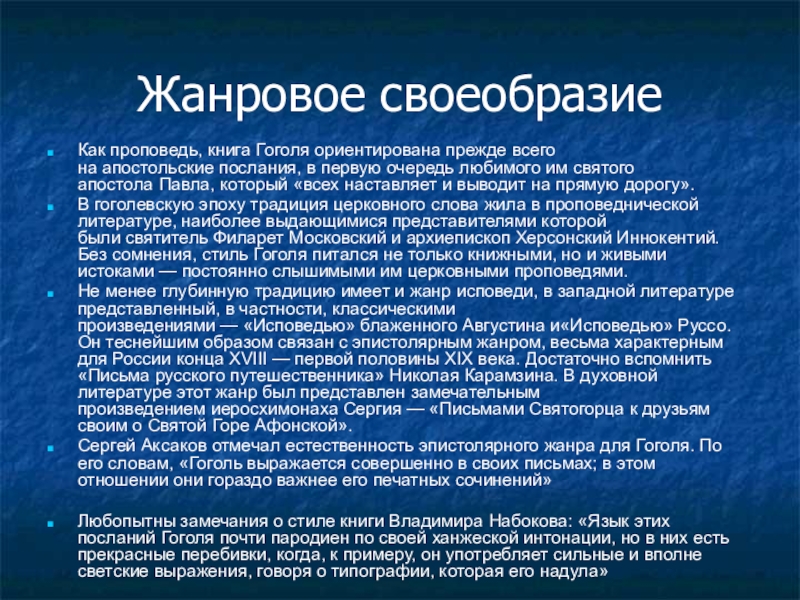 Как проповедь, книга Гоголя ориентирована прежде всего на апостольские послания, в первую очередь
