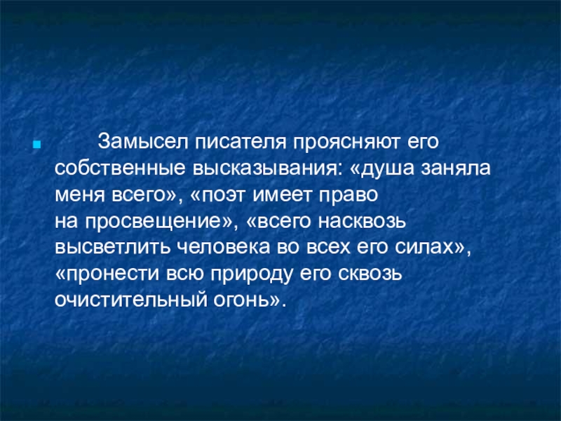 Слайд 13 Замысел писателя проясняют его собственные высказывания: «душа заняла меня всего», «поэт