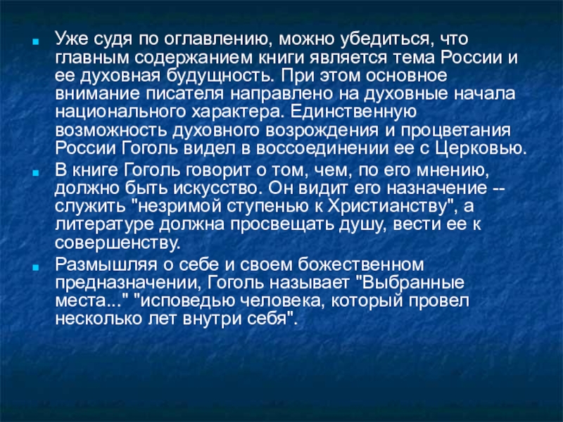Размышляя о себе и своем божественном предназначении, Гоголь называет "Выбранные места..." "исповедью человека, который провел несколько лет внутри себя".