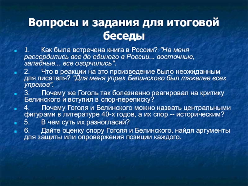 3. Почему же Гоголь так болезненно реагировал на критику Белинского и вступил в спор-переписку?