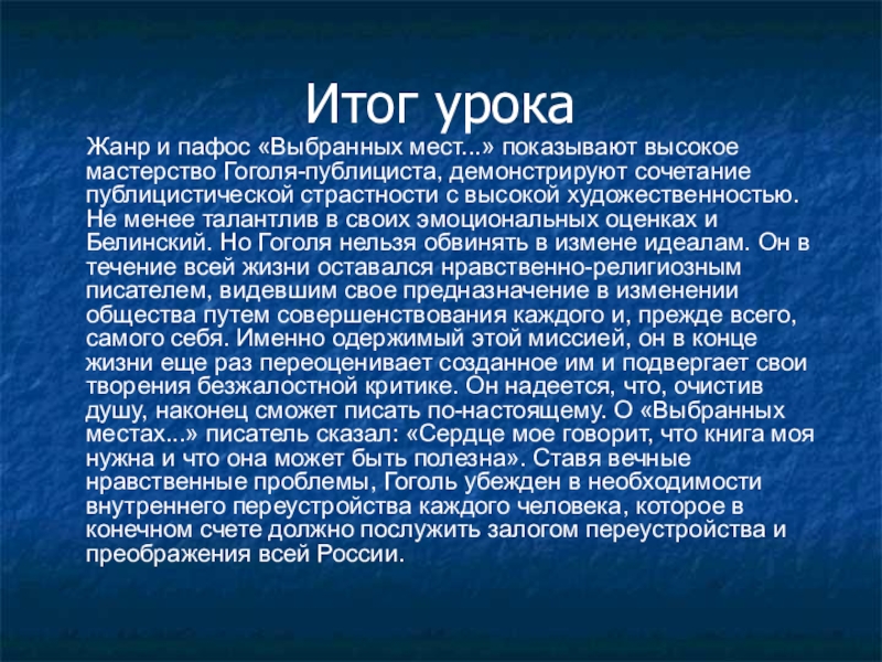 Гоголя-публициста, демонстрируют сочетание публицистической страстности с высокой художественностью. Не менее талантлив в своих эмоциональных оценках и Белинский. Но Гоголя нельзя обвинять в измене идеалам. Он в течение всей жизни оставался нравственно-религиозным писателем, видевшим свое предназначение в изменении общества путем совершенствования каждого и, прежде всего, самого себя. Именно одержимый этой миссией, он в конце жизни еще раз переоценивает созданное им и подвергает свои творения безжалостной критике. Он надеется, что, очистив душу, наконец сможет писать по-настоящему. О «Выбранных местах...» писатель сказал: «Сердце мое говорит, что книга моя нужна и что она может быть полезна». Ставя вечные нравственные проблемы, Гоголь убежден в необходимости внутреннего переустройства каждого человека, которое в конечном счете должно послужить залогом переустройства и преображения всей России.