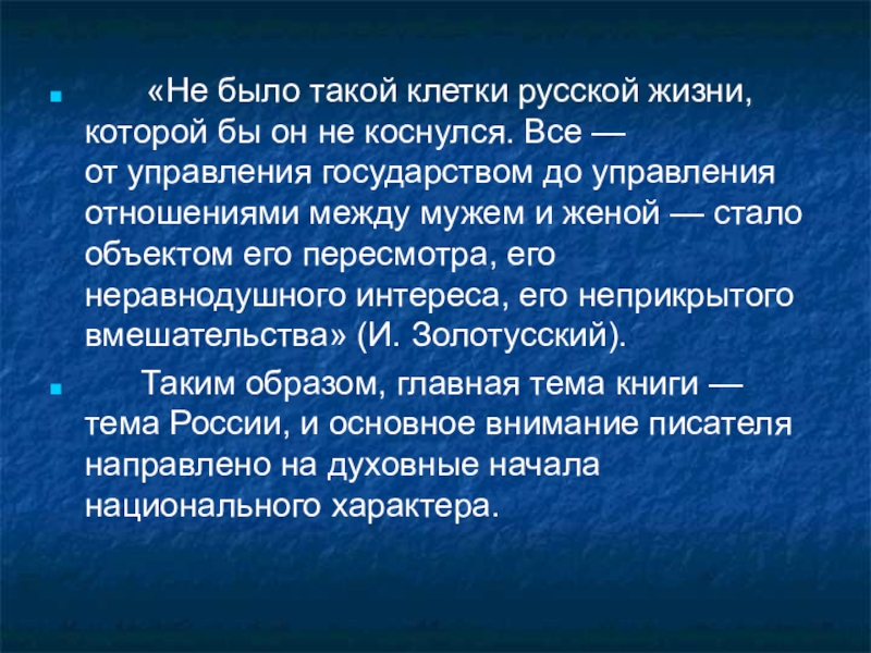 Таким образом, главная тема книги — тема России, и основное внимание писателя направлено на духовные начала национального характера.