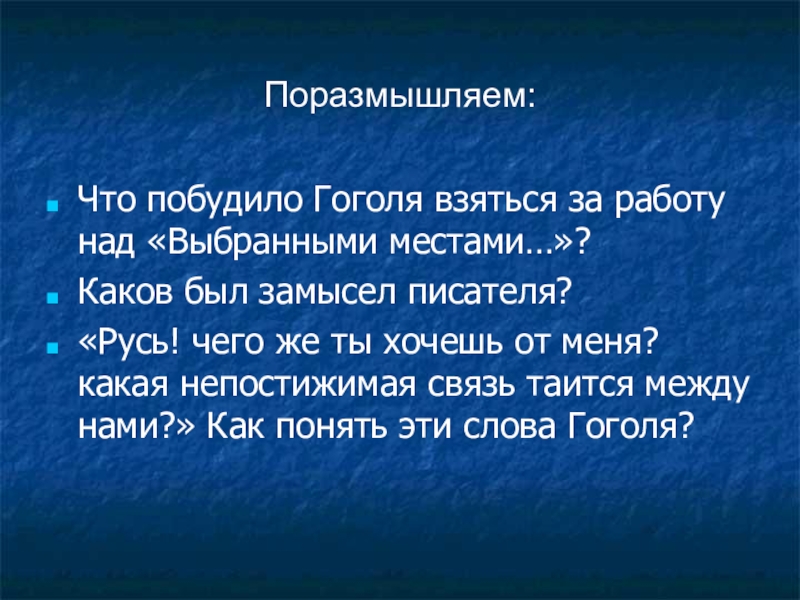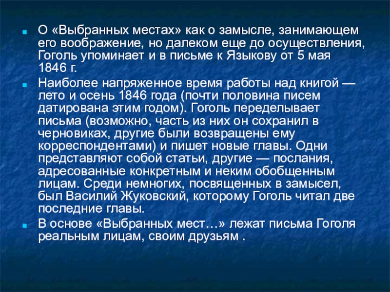 Слайд 7О «Выбранных местах» как о замысле, занимающем его воображение, но далеком