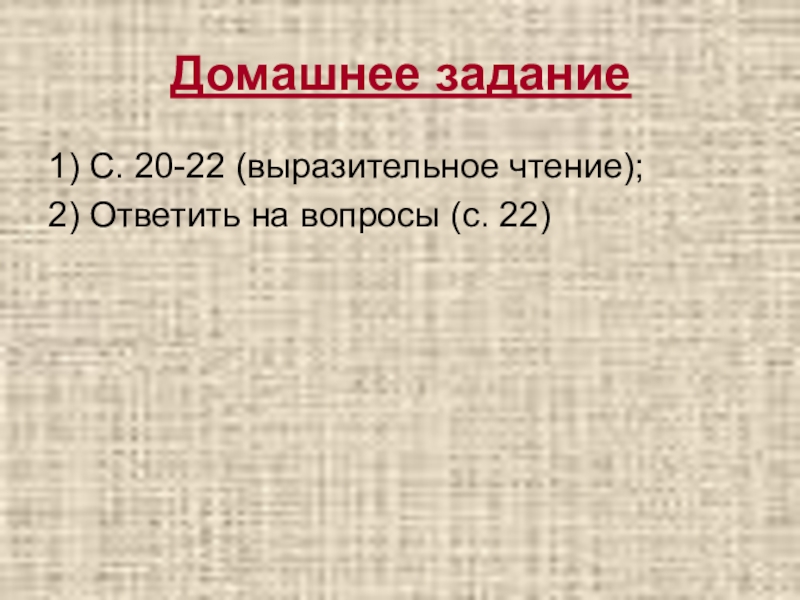 Домашнее задание1) С. 20-22 (выразительное чтение);2) Ответить на вопросы (с. 22)