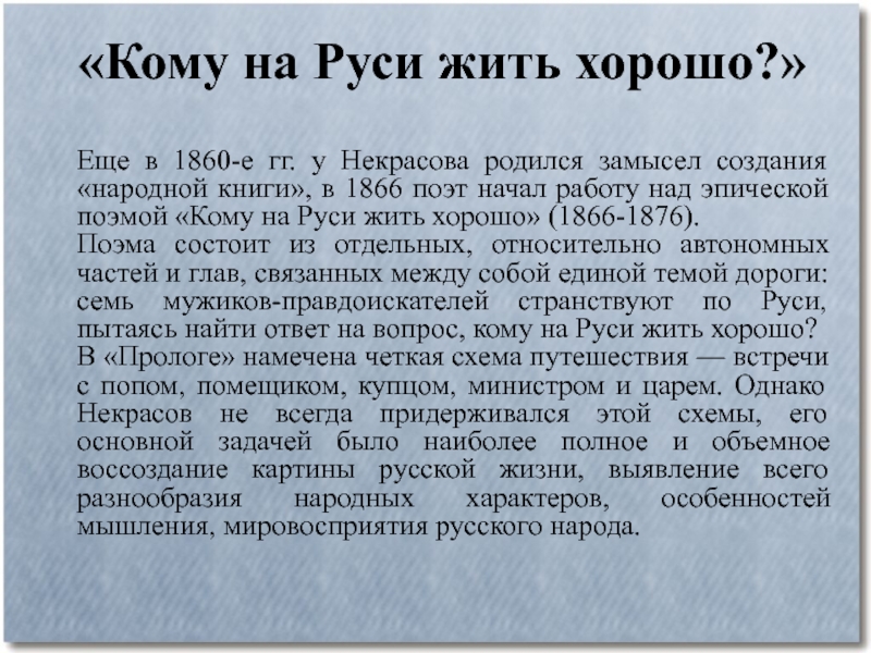 замысел создания «народной книги», в 1866 поэт начал работу над эпической поэмой «Кому на Руси жить хорошо» (1866-1876).