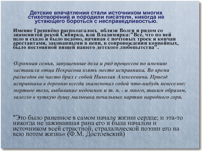 Детские впечатления стали источником многих стихотворений и породили писателя, никогда не устающего бороться с несправедливостью.