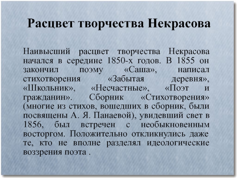 Наивысший расцвет творчества Некрасова начался в середине 1850-х годов.