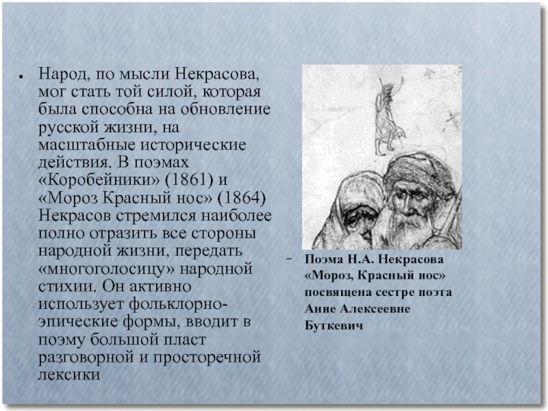 на обновление русской жизни, на масштабные исторические действия. В поэмах «Коробейники» (1861) и «Мороз Красный нос» (1864) Некрасов стремился наиболее полно отразить все стороны народной жизни, передать «многоголосицу» народной стихии. Он активно использует фольклорно-эпические формы, вводит в поэму большой пласт разговорной и просторечной лексики