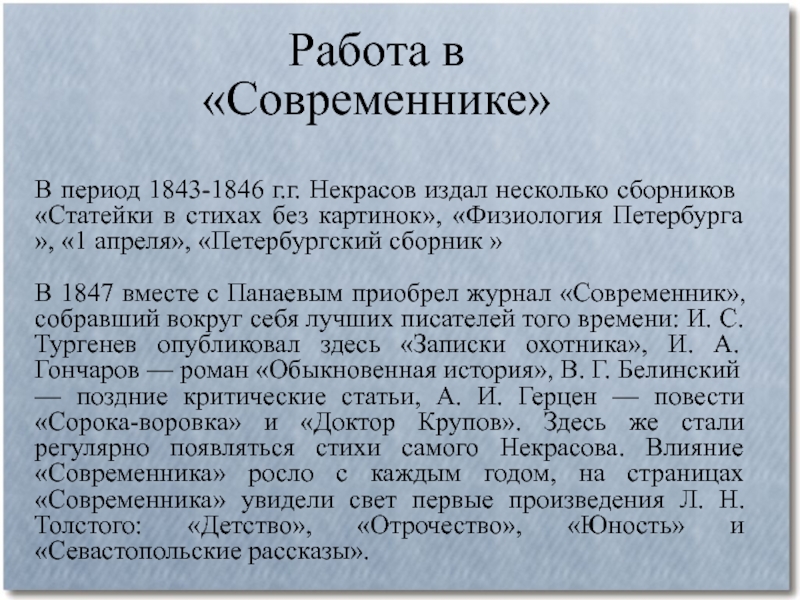 В период 1843-1846 г.г. Некрасов издал несколько сборников «Статейки