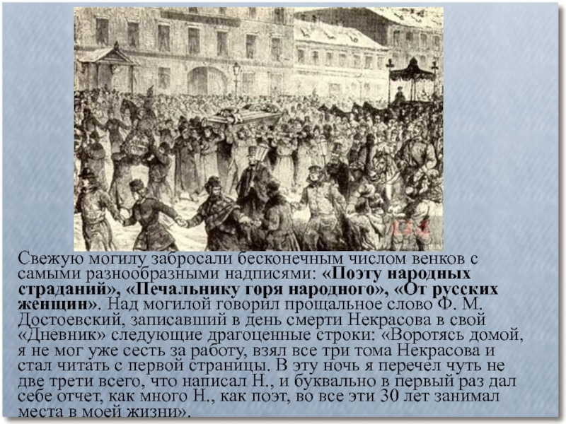 народных страданий», «Печальнику горя народного», «От русских женщин». Над могилой говорил прощальное слово Ф. М. Достоевский, записавший в день смерти Некрасова в свой «Дневник» следующие драгоценные строки: «Воротясь домой, я не мог уже сесть за работу, взял все три тома Некрасова и стал читать с первой страницы. В эту ночь я перечел чуть не две трети всего, что написал Н., и буквально в первый раз дал себе отчет, как много Н., как поэт, во все эти 30 лет занимал места в моей жизни».