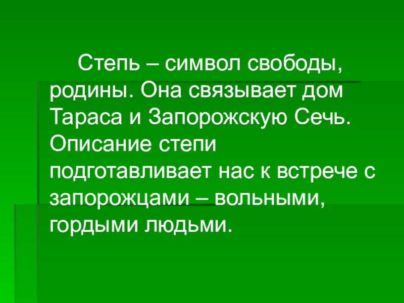 Степь – символ свободы, родины. Она связывает дом Тараса и Запорожскую Сечь. Описание