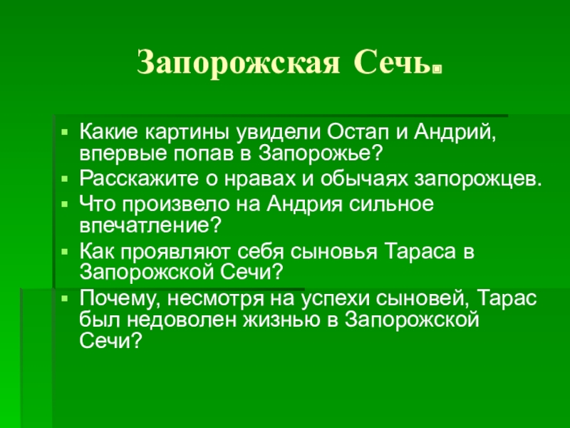дом Тараса и Запорожскую Сечь. Описание степи подготавливает нас к встрече с запорожцами – вольными, гордыми людьми.