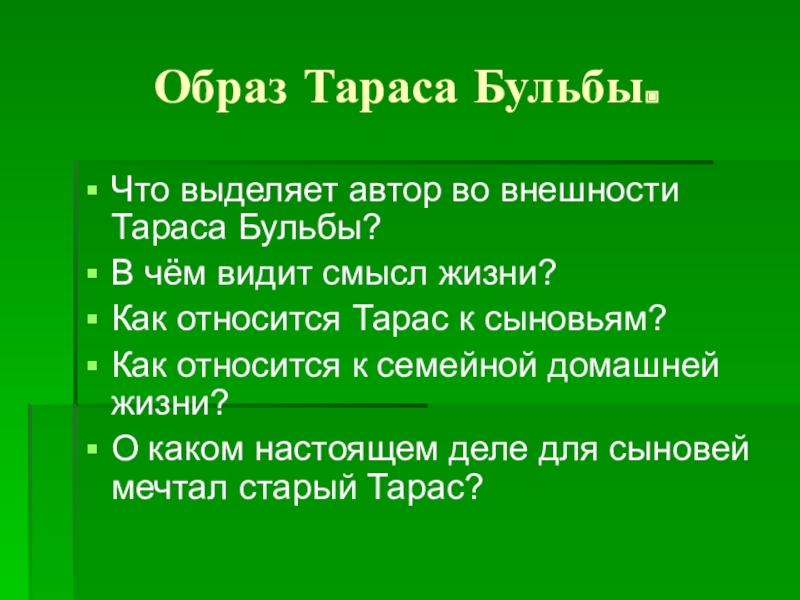 Образ Тараса Бульбы.Что выделяет автор во внешности Тараса Бульбы?В чём видит смысл жизни?Как относится Тарас к сыновьям?Как относится к семейной домашней жизни?О каком настоящем деле для сыновей мечтал старый Тарас?