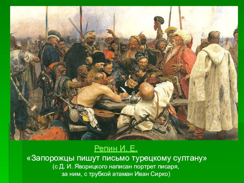 Репин И. Е. «Запорожцы пишут письмо турецкому султану» (с Д. И. Яворицкого написан портрет писаря, за ним, с трубкой