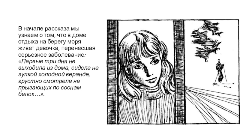 на берегу моря живет девочка, перенесшая серьезное заболевание: «Первые три дня не выходила из дома, сидела на гулкой холодной веранде, грустно смотрела на прыгающих по соснам белок…».